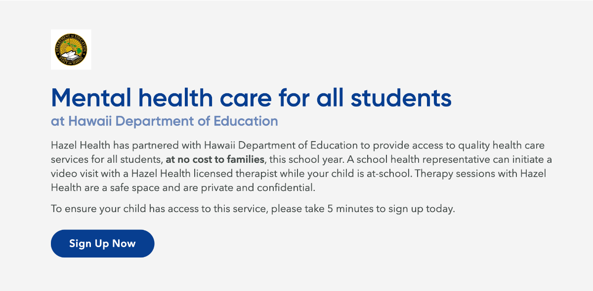 We had the opportunity to learn more about a new partnership between the Hawaiʻi DOE and Hazel Health to make mental health services available for free to all public school students. This could be a great option for students who need but can’t otherwise access supports like therapy due to cost or therapist availability.