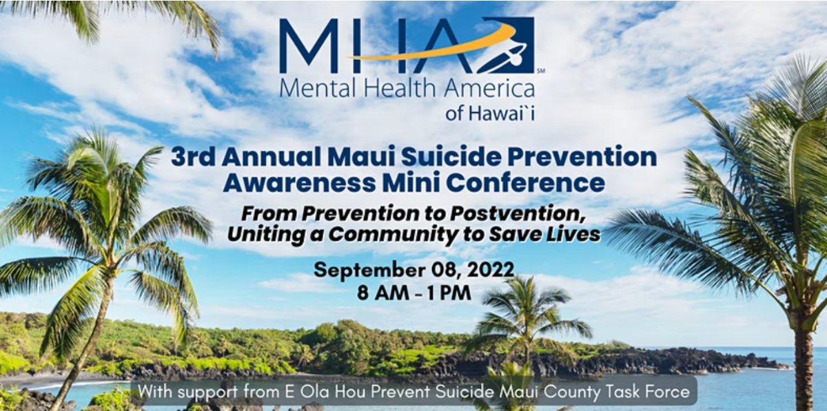 RCSF partner Papa Ola Lōkahi is co-sponsoring the 3rd Annual Maui Suicide Prevention Awareness Mini Conference, which will take place on Thu, September 8, 2022 from 8:00am-1pm. Registration closes on August 31 at 11:00pm.