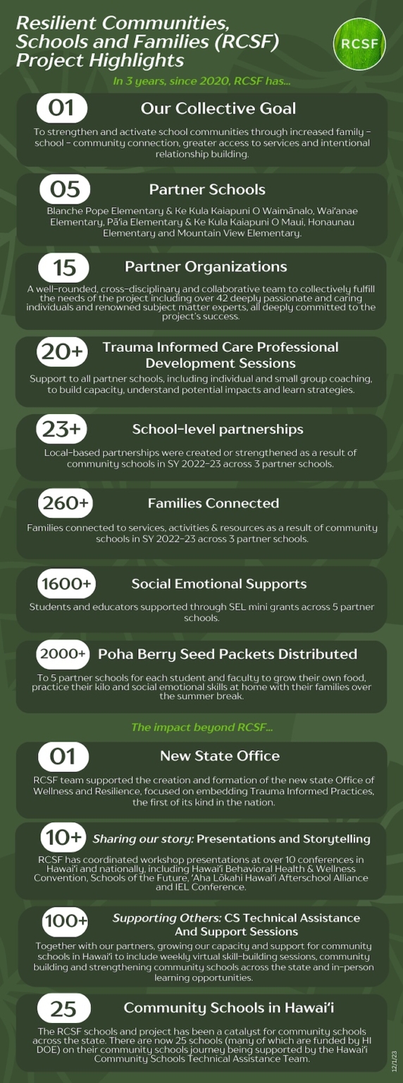 The first year of the Resilient Community Schools Partnership focused on setting a strong foundation for the project in the following areas: partnership development; school selection, onboarding and coordination; planning the content and delivery of Trauma Informed Practice (TIP) professional development; coordinating the Social Emotional Learning (SEL) mini-grants and ASCA-Certification; Community Schools outreach; and the ‘Ohana Resilience Intervention development. The subsequent years of the project focused on strengthening this foundation, learning from our communities and adjusting our model to be more responsive to each community’s unique needs, building capacity to expand the community schools model, and providing outstanding service delivery to the communities we serve.