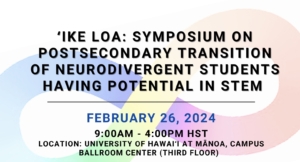 As part of pre-conference events for the Pac Rim Conference hosted by Center on Disability Studies (CDS) at the University of Hawaiʻi at Mānoa’s College of Education, check out the Symposium on Postsecondary Transition of Neurodivergent Students Having Potential in STEM.