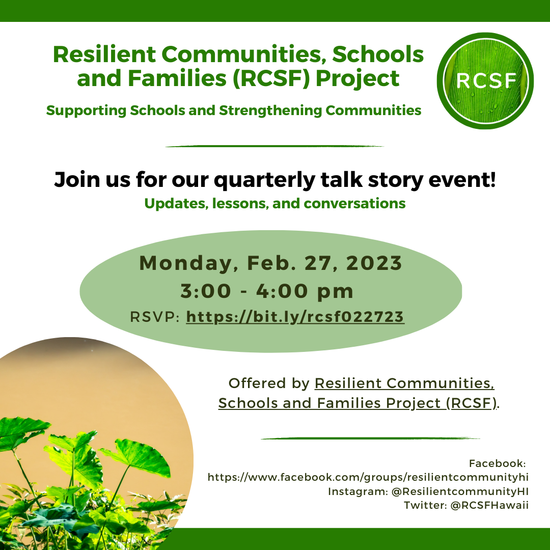 Reminder – Our project relies on the power of human connection, which is why we are excited to offer quarterly opportunities to talk story with our team and learn how the project is having an impact. The first event is coming up on Monday, February 27 from 3-4pm HST, so don’t wait to register today!