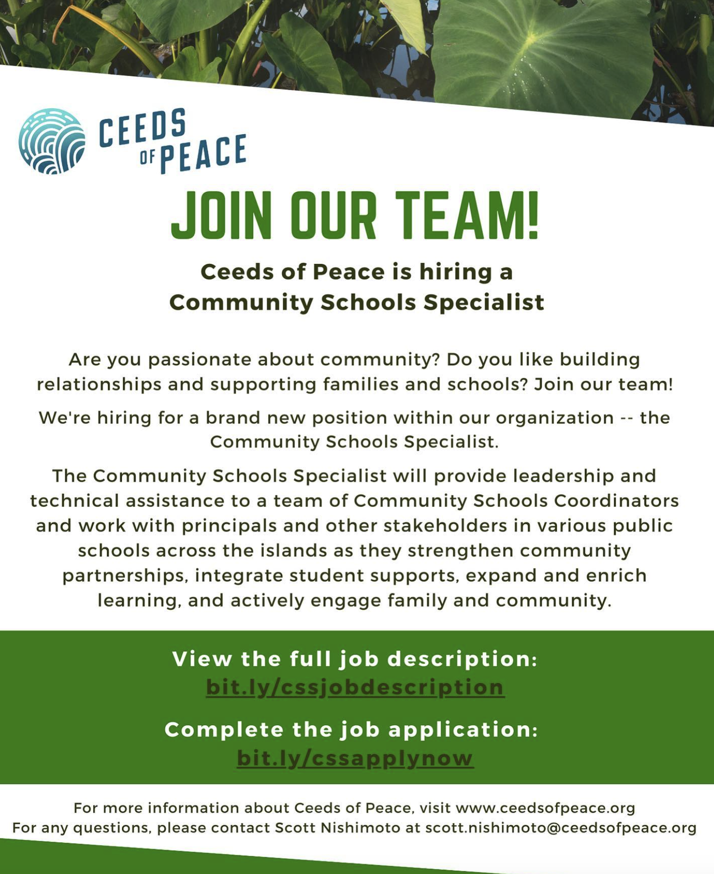 Want to do this work with us? Apply now to join the Ceeds of Peace team as a Community Schools Specialist!