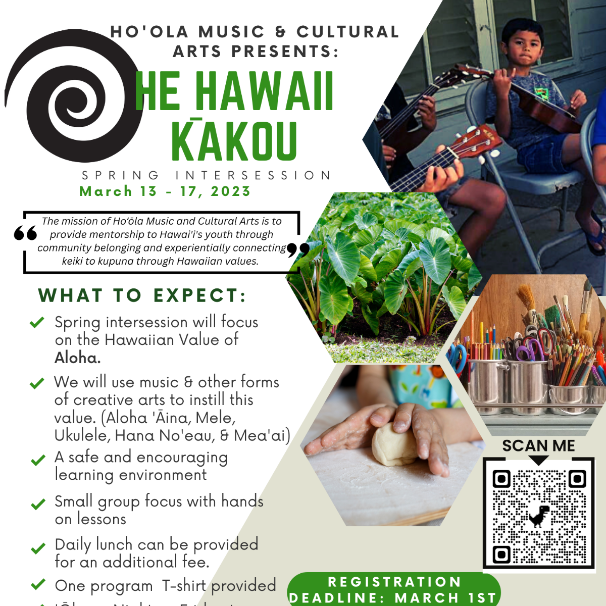 Local organization Ho’ōla Music and Cultural Arts is hosting a Spring Intersession Program in for youth in K-6th grades. This program consists of Music, Art, Aloha Aina and Character building, so click here to register.