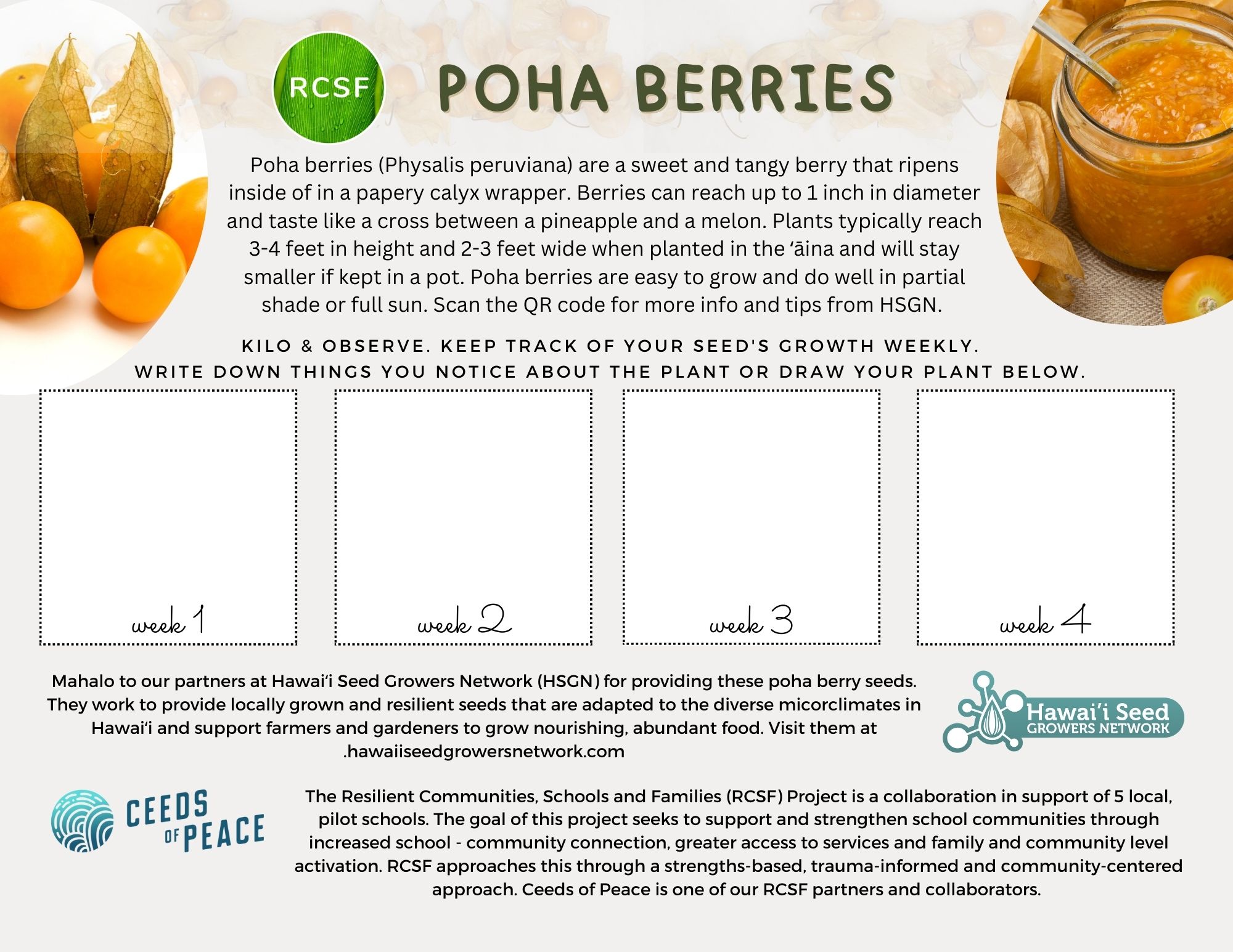 Congratulations to our educators and partner schools for a fantastic school year! Upon the close of the 2022-23 school year, the RCSF project provided a small gift to each student. Over 2,000 poha berry seed packets were distributed to our 5 partner schools with the intention for families to plant and grow together over the summer. A worksheet about poha berries, kilo (keen observation) log and growing instructions and tips were distributed to all students to support this fun summer activity.