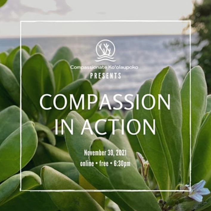 Compassionate Ko‘olaupoko on November 30, 6:30-7:30 pm, for Compassion in Action, a virtual celebration of the many everyday heroes in Ko‘olaupoko who are working tirelessly to strengthen a culture of caring in our communities. Help us honor the many community assets we have in Ko‘olaupoko, make connections, and learn how you can be a part of the action.