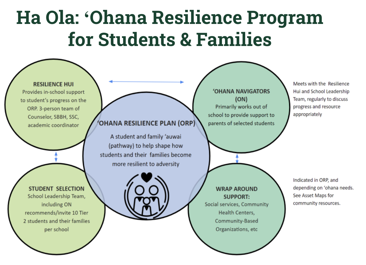 With a culture of health and Native Hawaiian values at the core of Hā Ola, support is strengths-based to help family members and others successfully navigate life situations. To guide resilience building activities, a tailored ʻOhana Resilience Plan (ORP) is co-designed by students and families with support of the school-based Resilience Hui and community-based ʻOhana Navigators. The Resilience Hui is a circle of support comprised of school staff and the ʻOhana Navigator, providing in-school support to students’ development and progress on the ʻOhana Resilience Plan. Housed in community health centers or community-based organizations, ‘Ohana Navigators provide support to parents of selected students and regularly meet with Resilience Hui and sit with the School Leadership Team. Collaboratively employing an assets-based approach, the ʻOhana Navigators and Resilience Hui support students and families to accomplish the goals and activities identified in their respective ʻOhana Resilience Plans to increase family well-being and resilience.