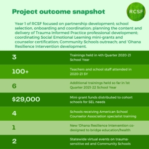 The COVID-19 pandemic has exacerbated existing stressors, meaning that many students have experienced some level of trauma. Schools are a beacon of hope, and the Resilient Communities, Schools and Families (RCSF) Partnership is a collaborative initiative that works with a cohort of Title I public schools (Mountain View El., Waiʻanae El., Pāʻia El., Hōnaunau El., and Blanche Pope El.) to drive innovation through transforming schools into holistic Community Schools with strengthened community partnerships, trauma sensitive practices, and wrap-around services. The project uplifts keiki and ʻohana through the care of a supportive community as they navigate the unpredictability of life.